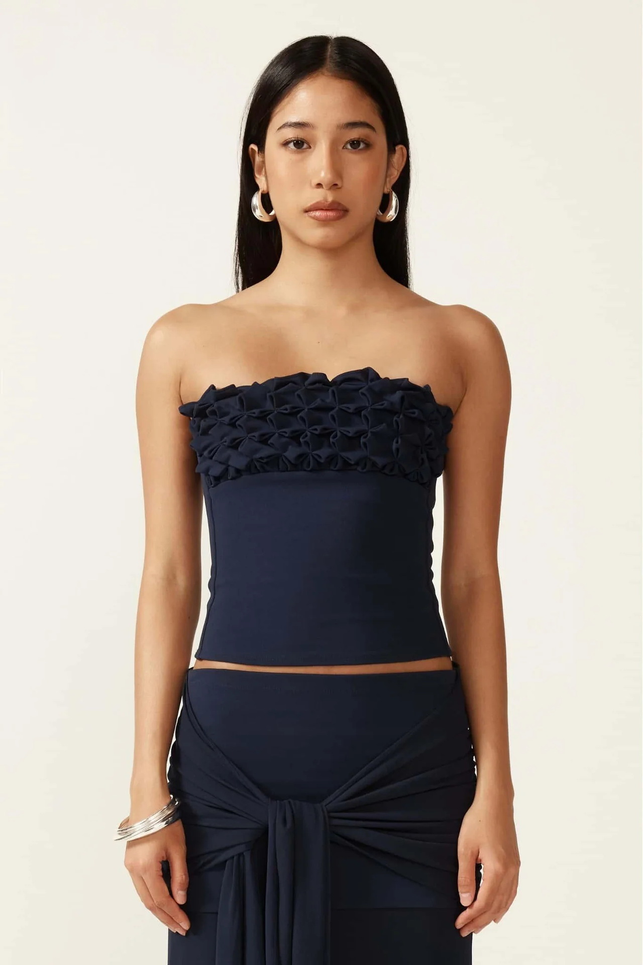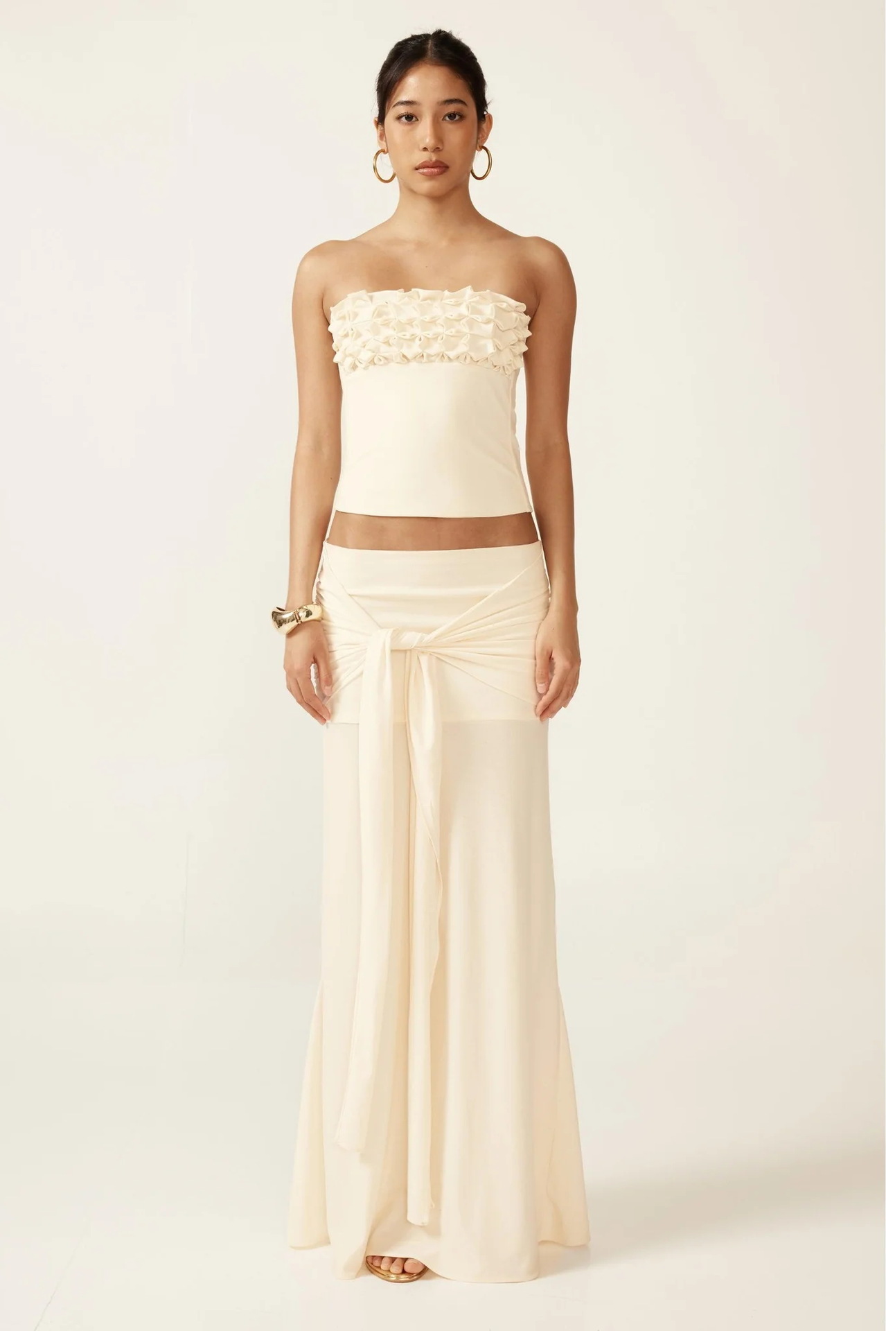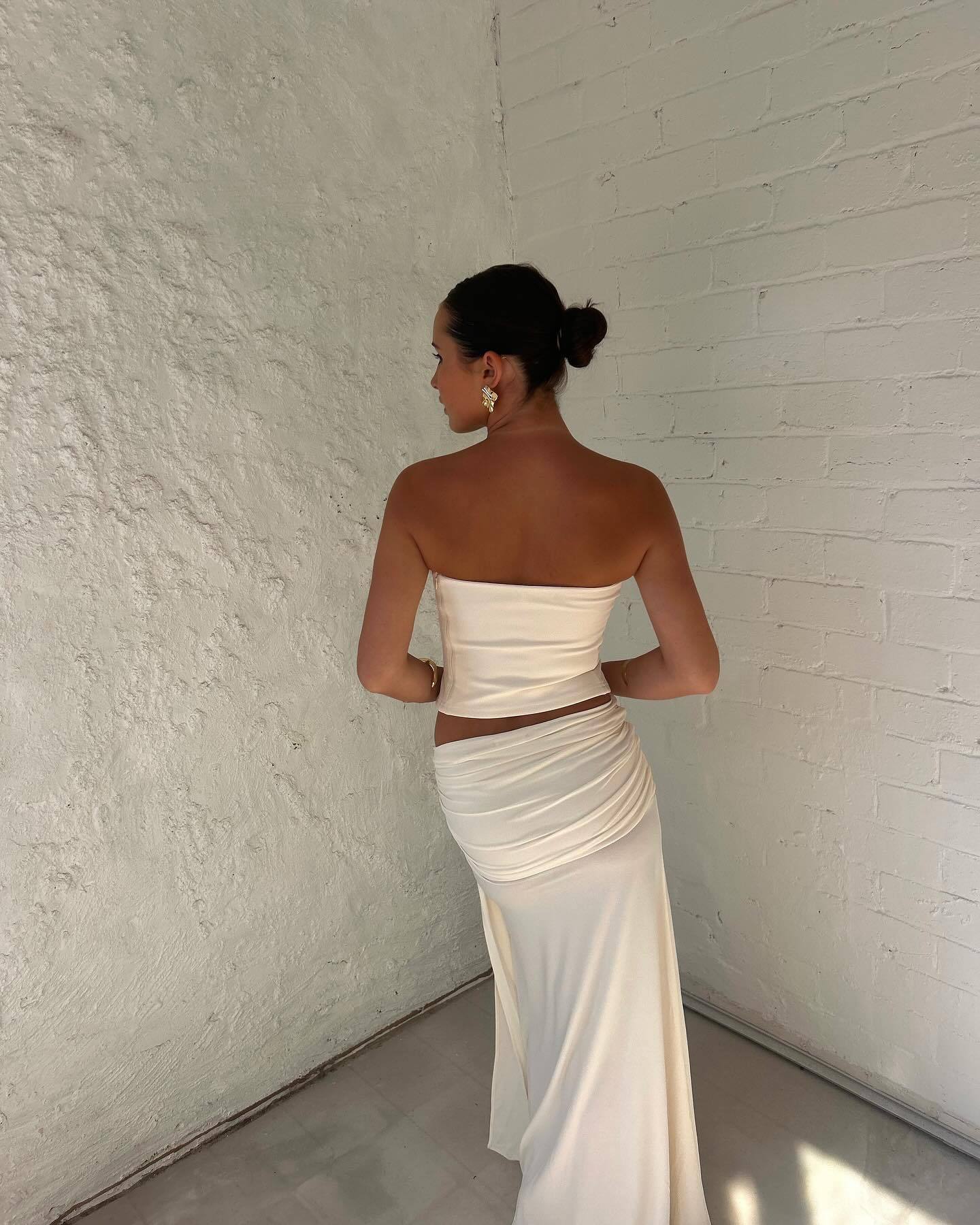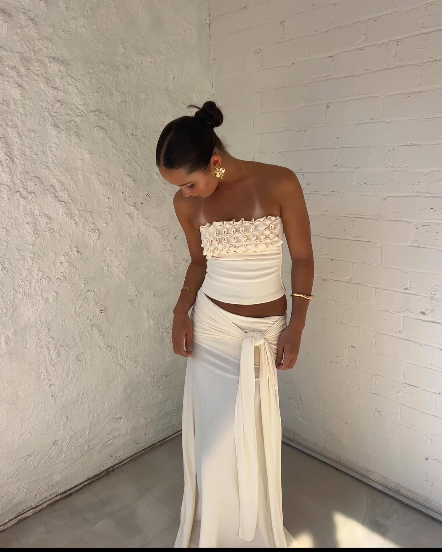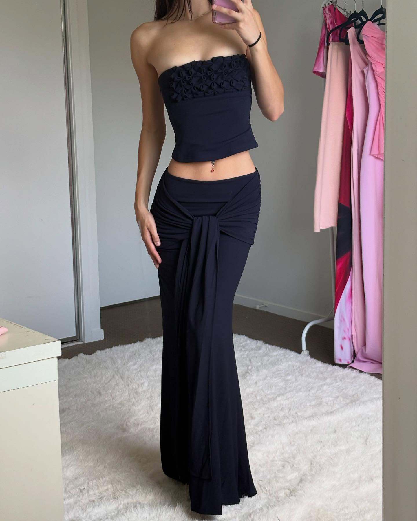 Sublimez votre présence avec cet ensemble deux pièces d'une sophistication rare. Mariant des textures travaillées et des lignes fluides, cet ensemble se compose d'un haut bustier court délicatement orné de reliefs floraux et d'une jupe longue magistrale. C'est la tenue de gala moderne par excellence, conçue pour celles qui recherchent une allure à la fois minimaliste et mémorable.